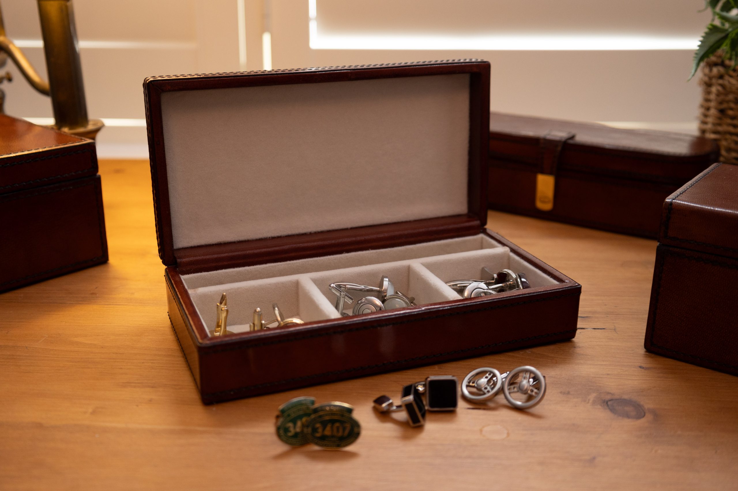 Cognac leather cufflink case containing three sections for cufflinks, and a narrow compartment for collar stiffeners.