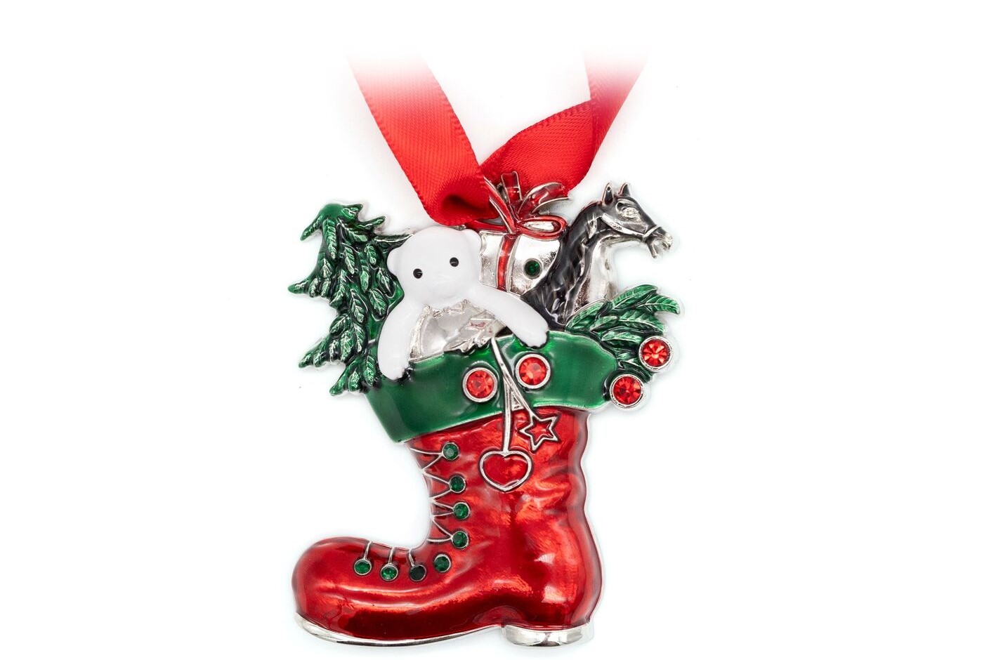 Silverplated Santa’s boot Christmas stocking hanging decoration with red,white, black and green enamel detail.