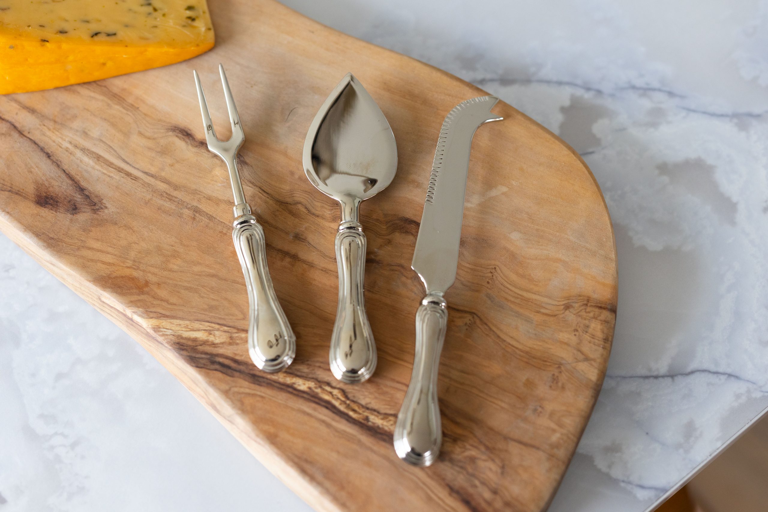 Silverplated Italia 3 piece Cheese Set, comprising cheese knife, serving fork and cheese server. Tarnish resistant finish.