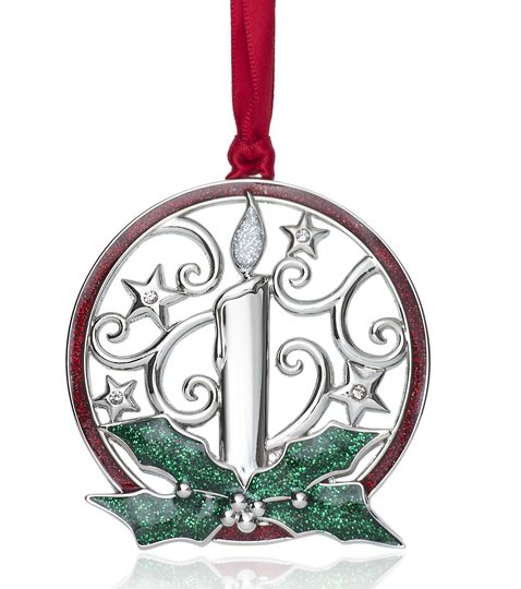 Silverplated Advent candle with red and green enamelling and sparkling flame hanging decoration. Tarnish resistant. Diameter 7cm