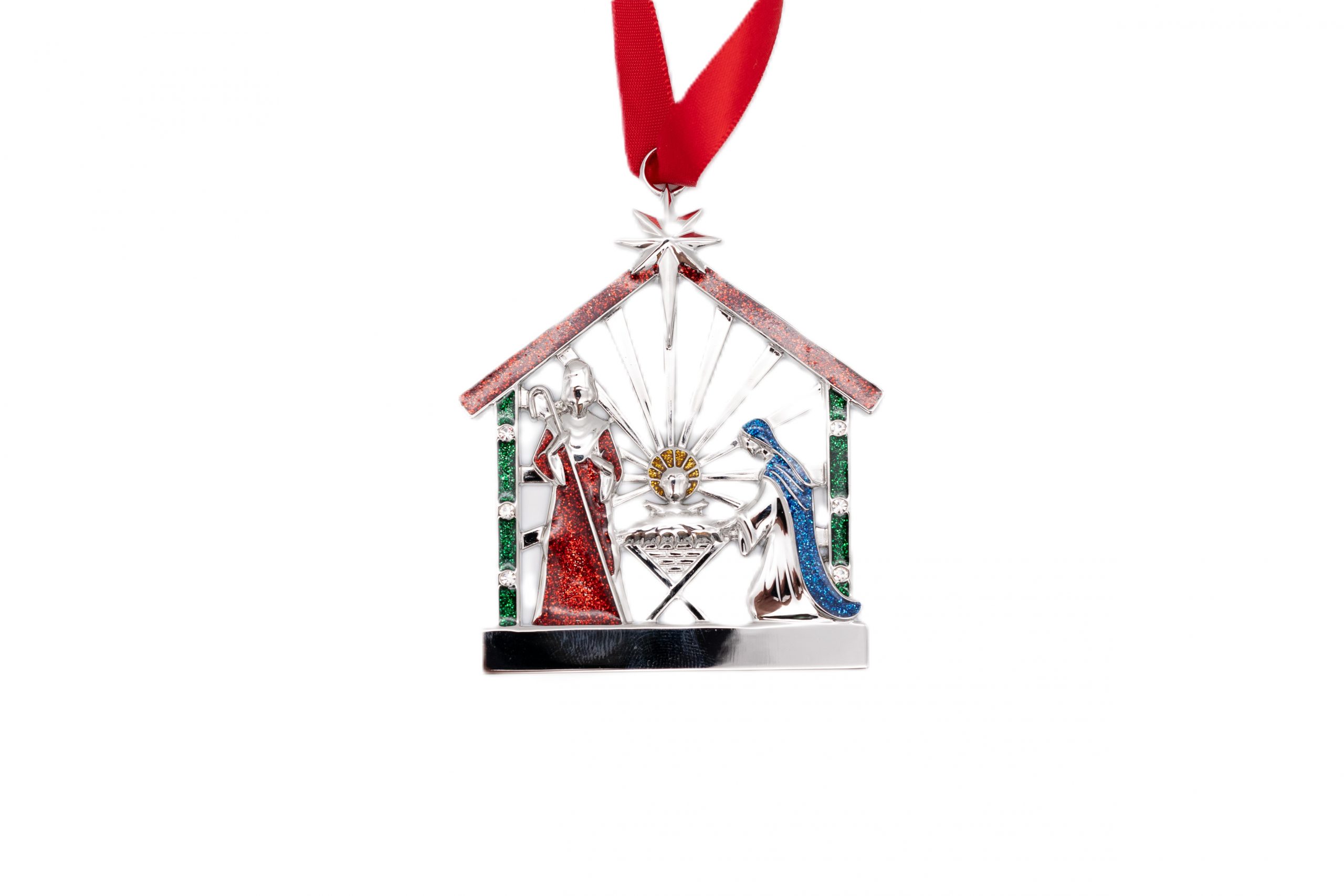 Silverplated Nativity scene hanging decoration with green, red and blue enamel.