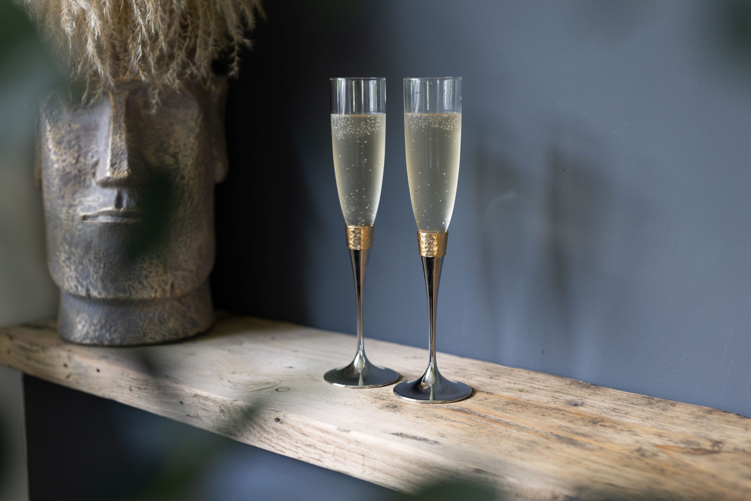 Pair of Silverplated stem and glass Champagne Flutes with brushed gold decoration.