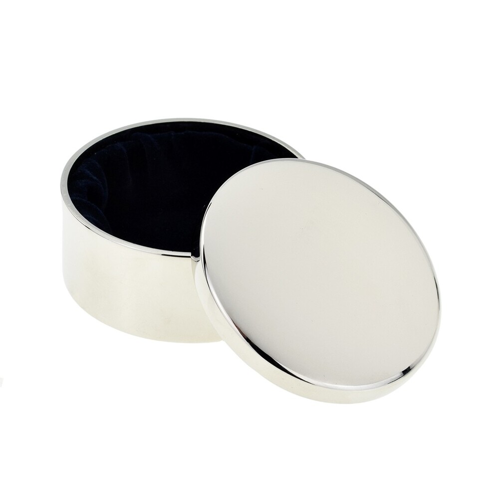 Silverplated round trinket box, suitable for rings or cufflinks, velvet lined.