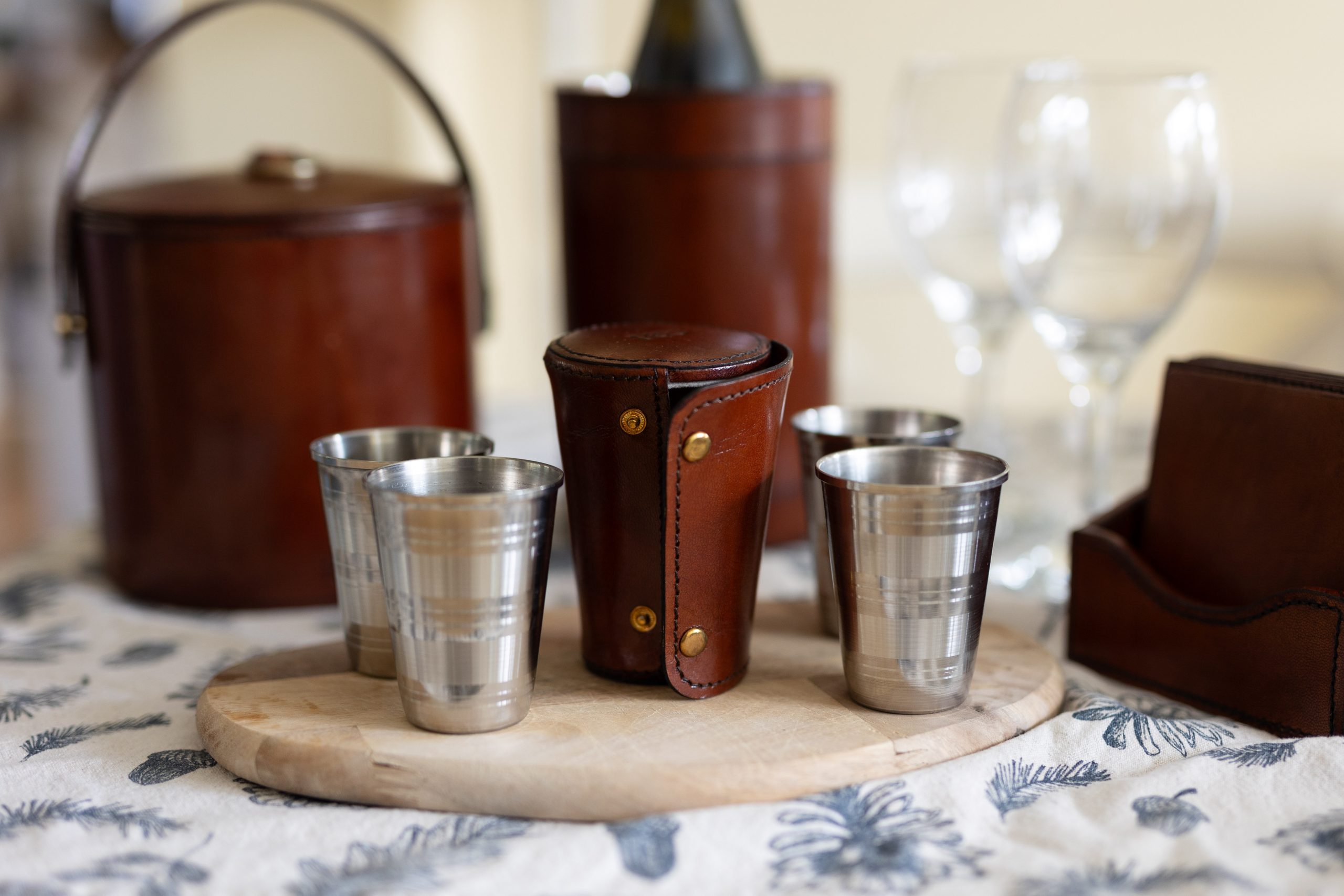 Compact and practical cognac leather cased set of four stackable stainless steel beakers.