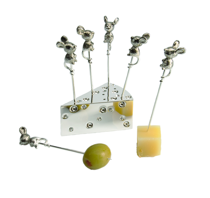 Funny and functional, these six silverplated picks with their cheeky little mice tops sit well on their cheesy wedge stand.