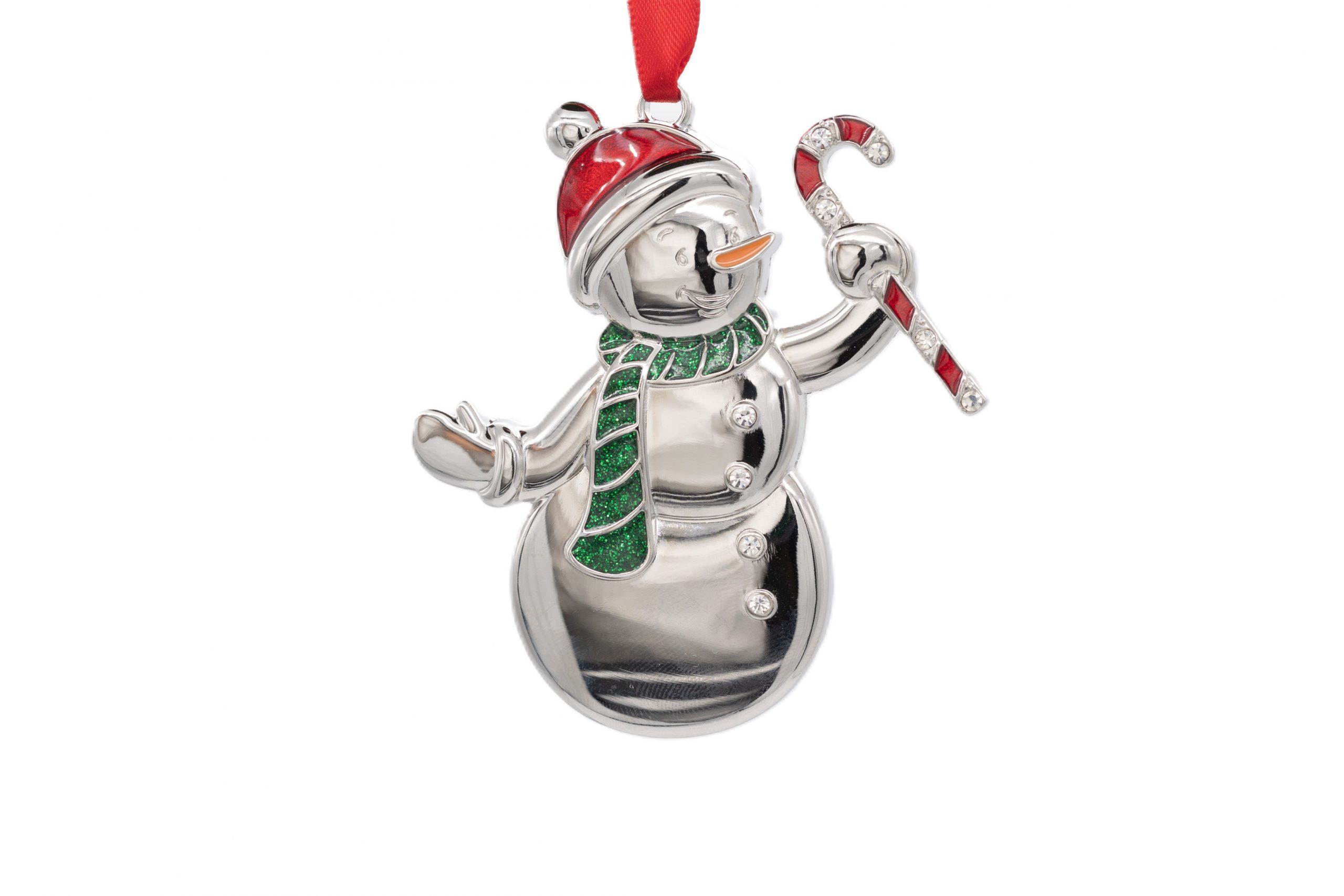 Silverplated Snowman holding candy cane with red and green enamel hanging decoration.