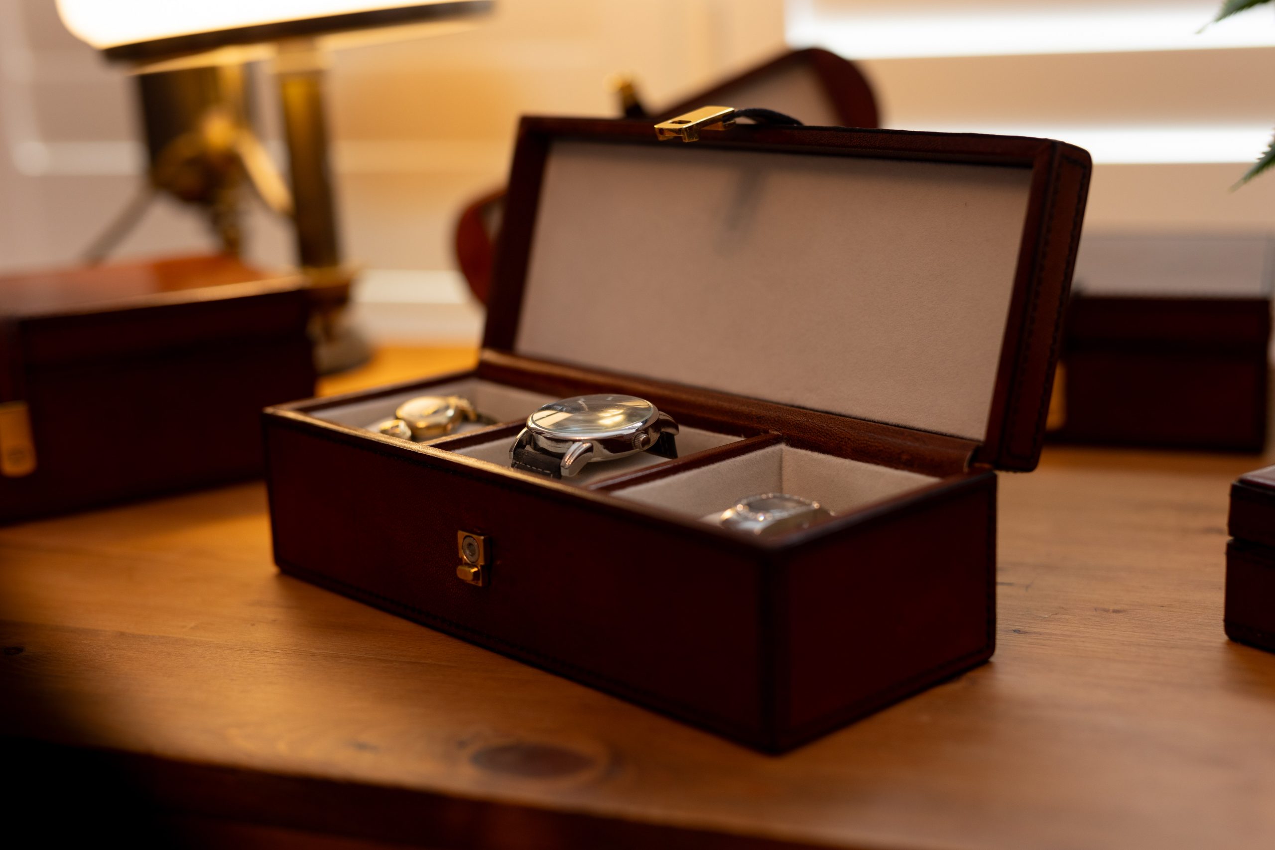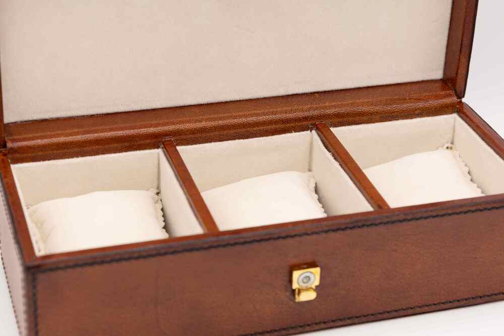 A smart leather case for safe storage including suedette cushions and matching lining.